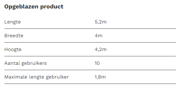 Afmeting grondoppervlak 5,2 x 4 meter en het kussen is 4,2 meter hoog.